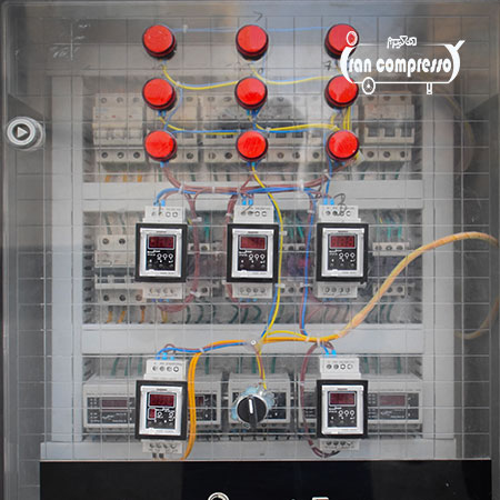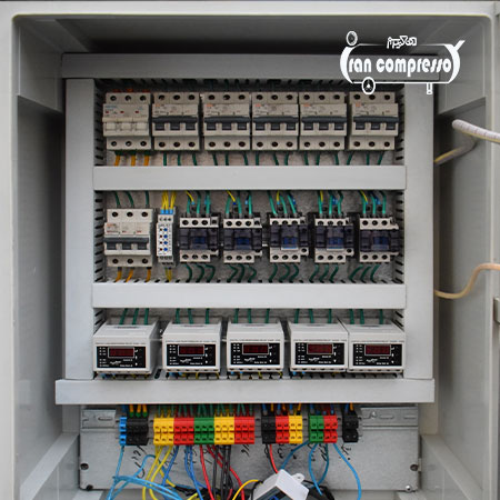 - تابلو برق اختصاصی ایران کمپرسور: با استفاده از یک تابلو برق صنعتی 3 فاز با ولتاژ 380 ولت، کنترل و مدیریت سیستم به بهترین شکل ممکن انجام میپذیرد. (تصویر 16: تابلو برق با تجهیزات کنترل و محافظت)